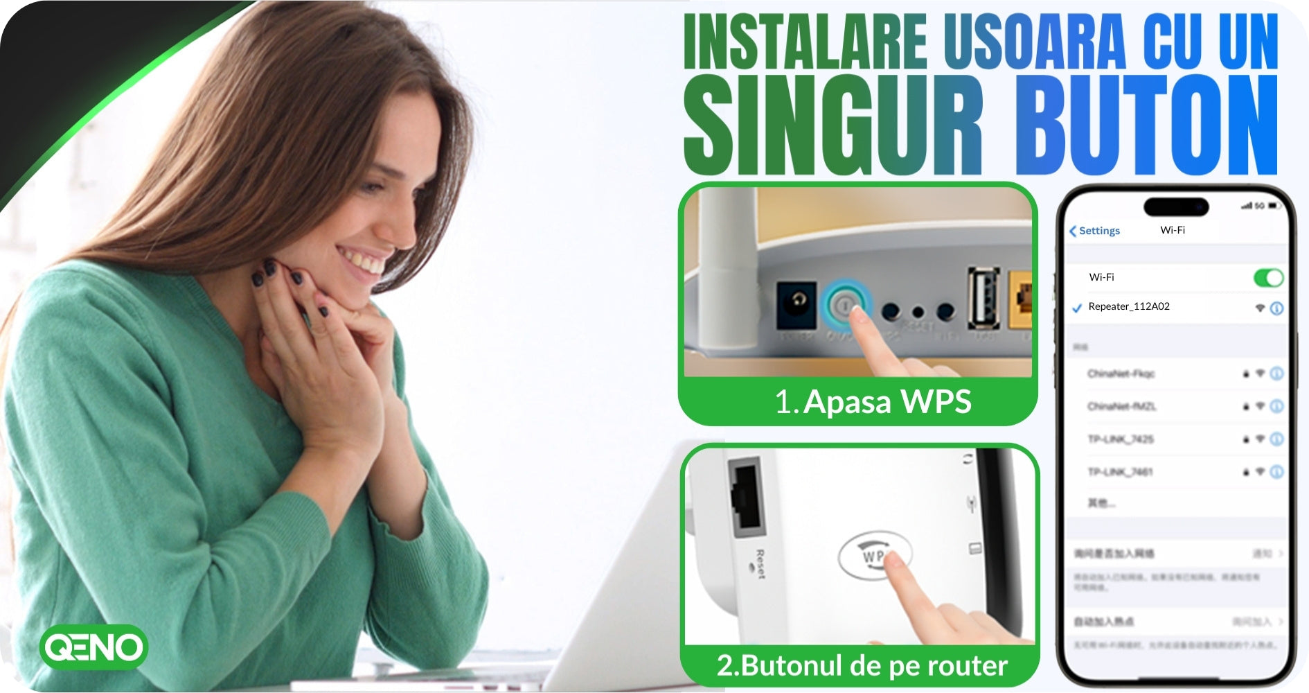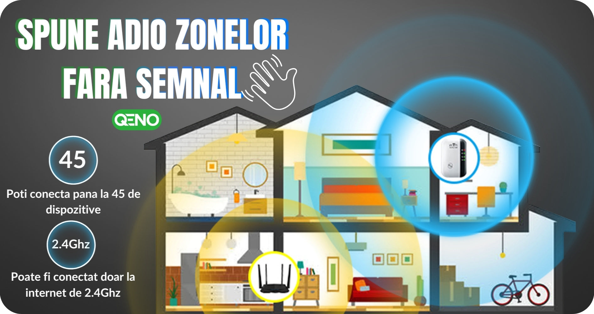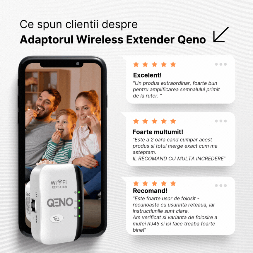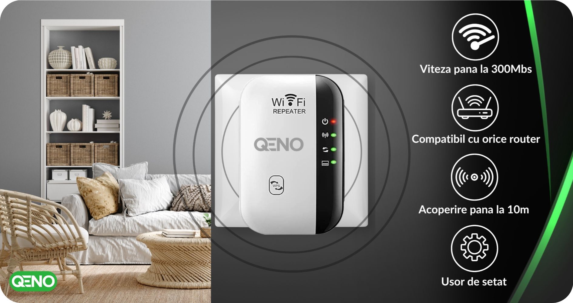 Adaptor Wireless Extender Qeno® Amplificator Semnal Range Wifi, poate asigura acces mai rapid la internet, fara fire sau cabluri.
