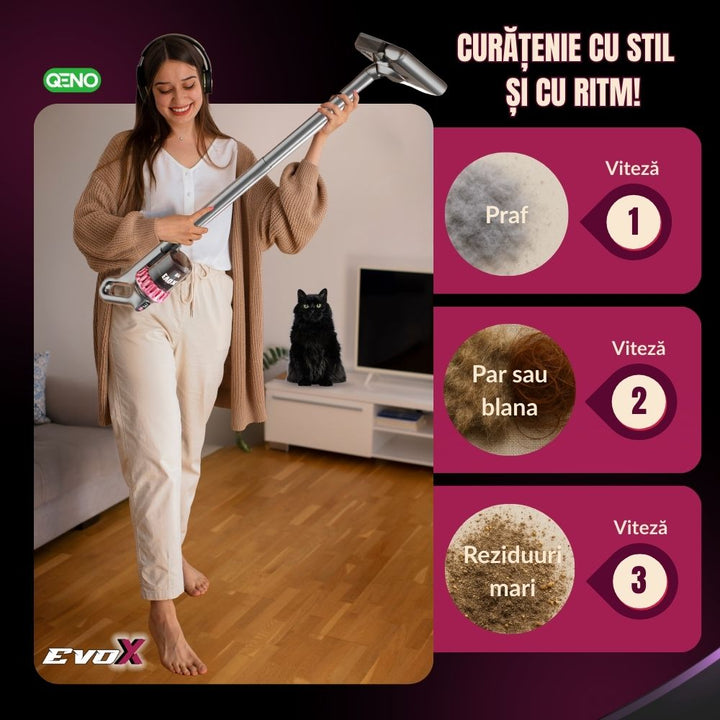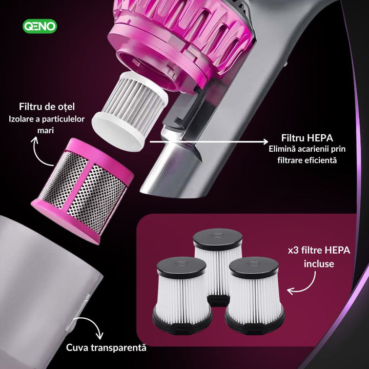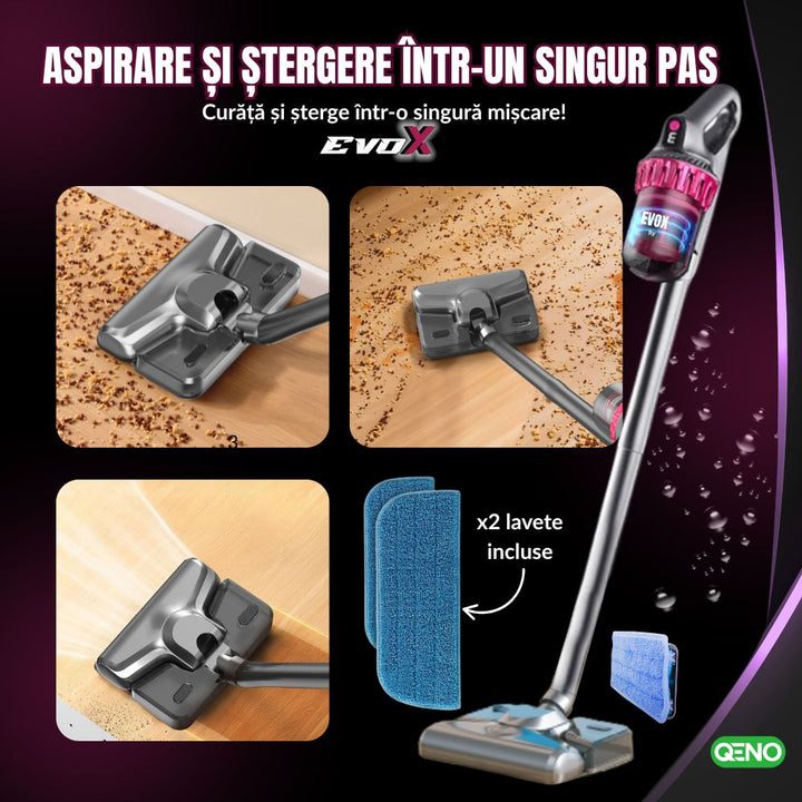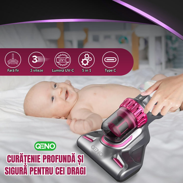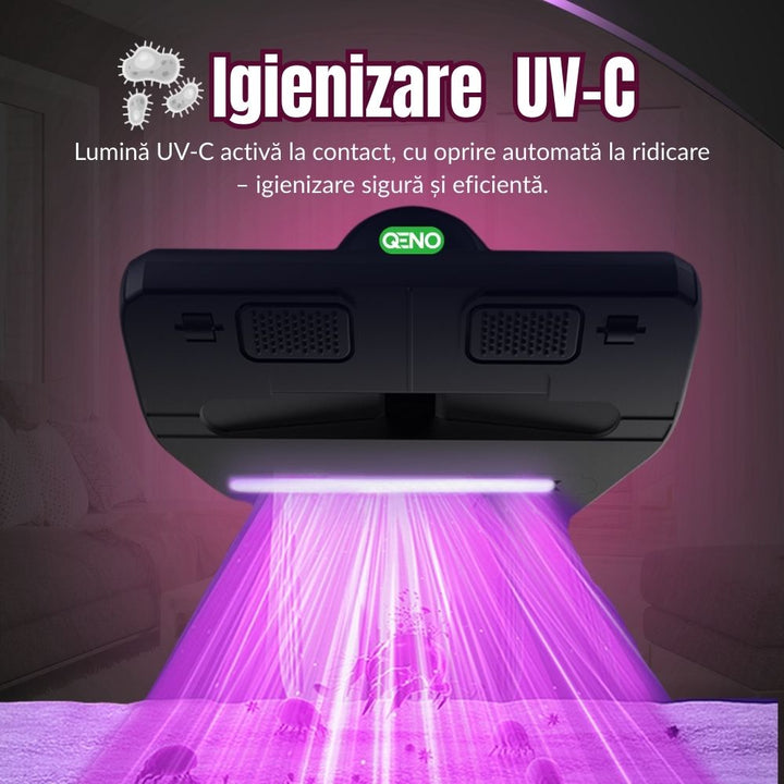 Transforma-ti rutina de curatenie cu aspiratorul vertical 5 in 1 Qeno de ultima generatie, care aspira, igienizeaza cu lumina UV si spala podelele cu ajutorul capatului mop si al lavetei lavabile. Cu o putere de aspirare de 10.000 Pa, 3 moduri reglabile si filtrare HEPA pe mai multe straturi, acest aparat este solutia completa pentru curatenie eficienta, fara chimicale, pe orice suprafata — de la saltele si covoare, pana la gresie, parchet si tapiterie.